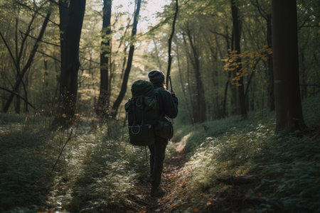 person, trekking through the forest with their trusty backpack and camera, created with generative ai