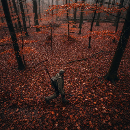 A lone hunter walks through a serene autumn forest with fallen leaves and vibrant trees during the early morning hours
