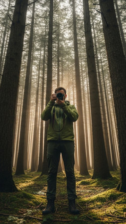 A high-definition, vertical full-body photograph of a male photographer standing centered in a dense