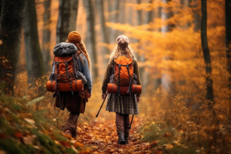 Group of Girls Walking Travel Hiking with Backpacks in the Autumn Forest extreme closeup. Generative AI