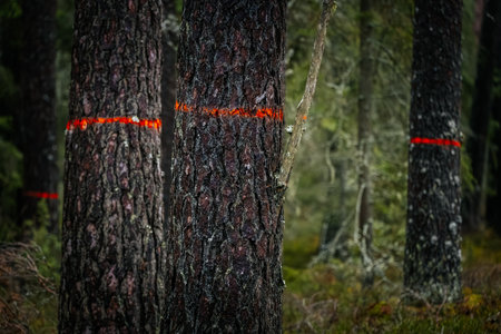 Forest scene featuring trees with vivid orange markings, highlighting forestry management and sustainability efforts in natural landscapes, promoting environmental awareness