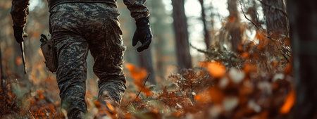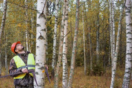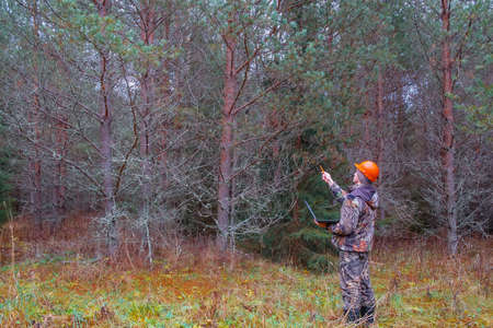 Hunter man in camouflage with a gun during the hunt in search of wild birds or game on the background of the autumn forest. Autumn hunting season. The concept of a hobby, killing. copy space.