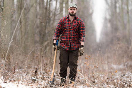 Hunting poacher in the forest. Hunter with shotgun gun on hunt. Hunter aiming rifle in forest.