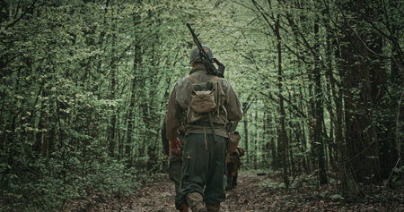 Forest hunter carrying a gun and a rucksack., Generative AI