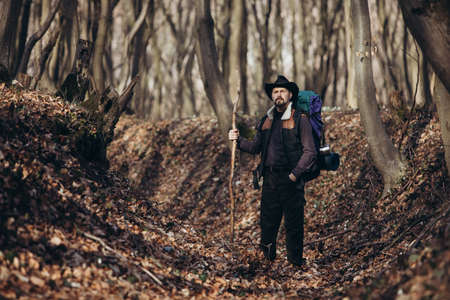 A young traveler with a backpack on a hike. Hiking in the fall forest . Tourist traveler against the background of the forest.