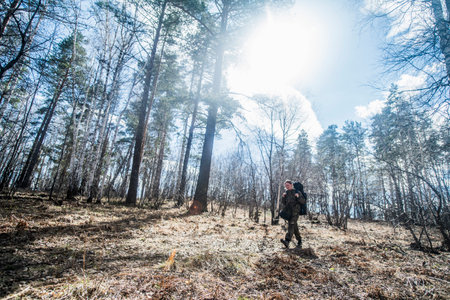 Backpacker man looks at sunrise in a pine forest. Back view. Copy space. Toned