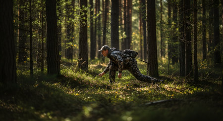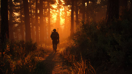 A soldier walks away into the dense forest, holding his rifle, with rays of the setting sun breaking through the trees. Cinematic tone.