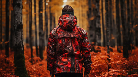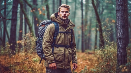 A lone hiker stands amidst a dense forest with autumn colors, preparing for an adventure in the wilderness during the early morning hours