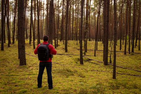 A man tourist in a bright red jacket with a backpack behind his back, standing in an autumn pine forest.