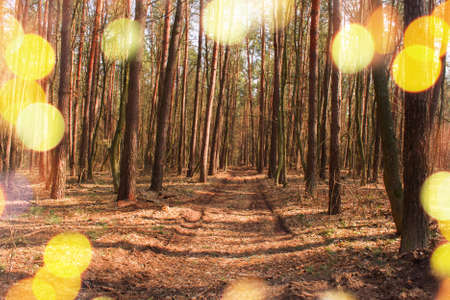 Pine forest at sunset. A ray of sunshine peeks through the trees. Skazany forest lit by the rays coming from the sun.