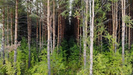 A beautiful view from the above to the forest in summer morning. Aero photography of the wild woods.