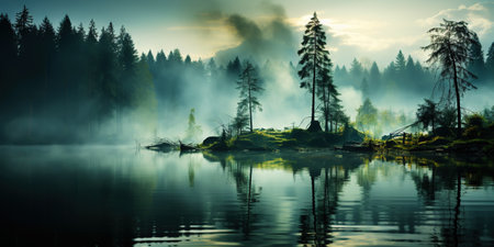 Discover the tranquil beauty of a serene forest lake, surrounded by towering evergreen trees and enveloped in mysterious fog. This peaceful scene invites reflection and relaxation in a captivating natural environment rich in greenery and calm waters.