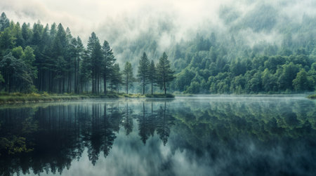 A serene lake reflecting misty forest, evoking tranquility and environmental preservation