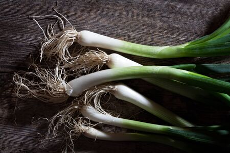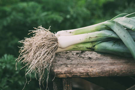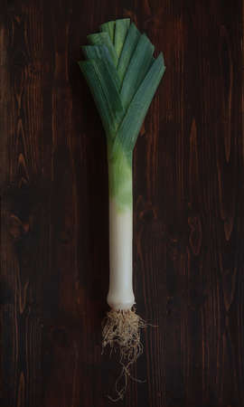 fresh organic leek on vintage oak table