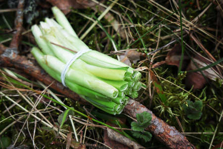 Fresh bunch of spring onions lying naturally upon the forest floor.