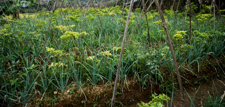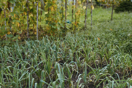 Vegetable garden with green plants and garlic bed in a backyard farm, dew covered early morning rows and vine trellis, organic soil, closeup of growing shoots in rural garden.