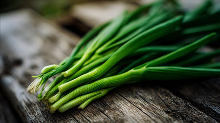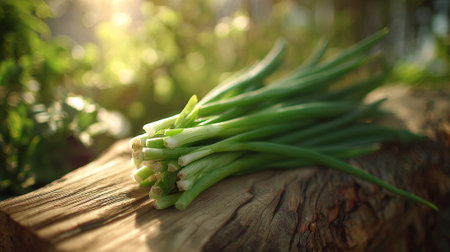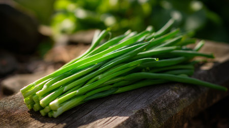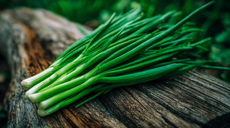Fresh green chives on rustic wooden surface, healthy and vibrant produce