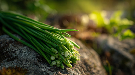 Fresh Green Chives Bundle Resting on a Rustic Rock Background