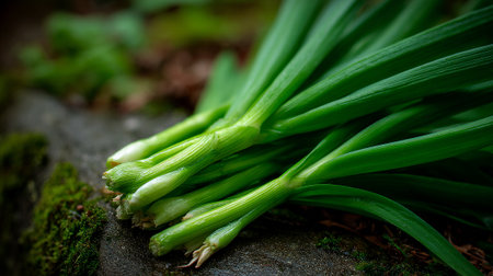 Freshly Harvested Green Onions Nestled on Mossy Rock: Culinary Delights