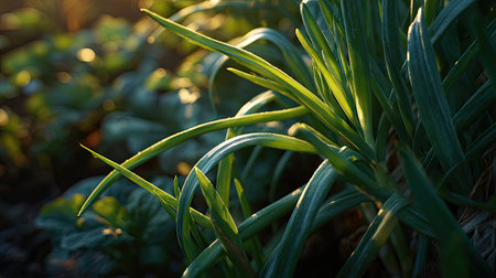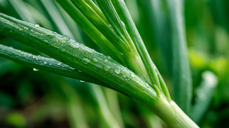 Fresh green onion stalks glistening with dew drops in early morning light