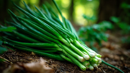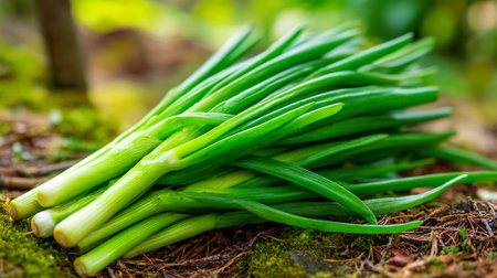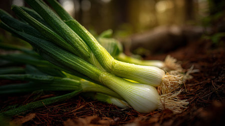 Freshly Harvested Green Onions Displayed on Forest Floor in Natural Light