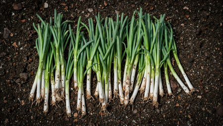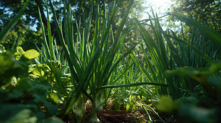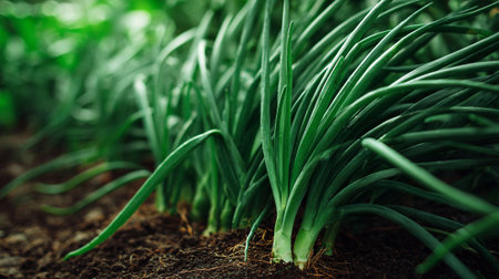 A vibrant view of fresh green onions thriving in a sunlit garden bed. This image captures the essence of nature, soil, and healthy growth. Perfect for agriculture themes.