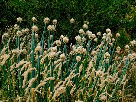 Close up of onion flowers blooming in the field, selective focus The beauty of nature can be found everywhere - plants so strong and beautiful captured in pictures forever.
