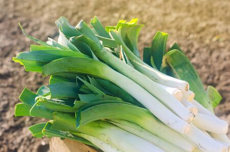 Freshly picked leek in box. Harvest. Harvesting. Agriculture and farming. Agribusiness. Agro industry. Growing Organic Vegetables. Selective focus