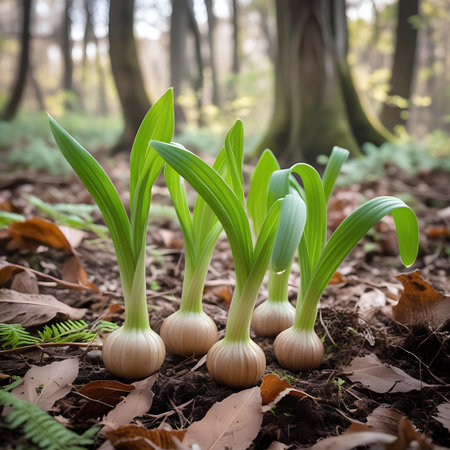 Young green shoots with visible bulbs emerge from the forest soil, surrounded by fallen leaves and tree trunks.