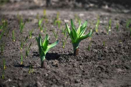 Bed with green garlic seedlings. Spring sowing of vegetables on the household farm. Vegetable garden with small sprouts