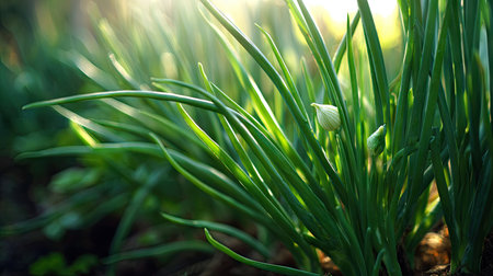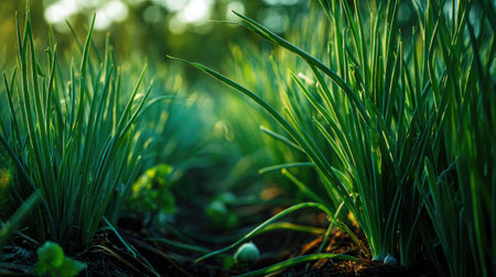 Lush green chives thrive in rich soil, basking in natural light, symbolizing freshness and growth in an organic garden. Ideal for culinary and wellness themes.