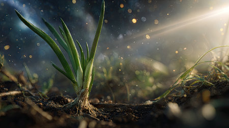 A cinematic wide shot of a young Scallion growing, slightly larger than before, surrounded by rich, dark soil and faint morning mist, golden sunlight breaking through the clouds, soft beams illuminating the growing plant, ultra-realistic photography with true Earth like realism natural hues, no artificial colors, cinematic composition, deep 3D parallax depth creating an immersive, awe inspiring atmosphere, subtle natural lens flares, minimal 35mm film grain, tranquil and hopeful tone, 8K, highly detailed.