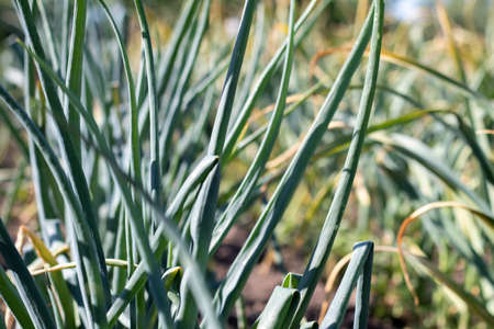 Fresh spring onions in the garden. Selective focus. Shallow depth of field