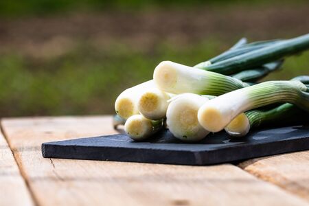 Organic leeks on a wooden surface, farm food