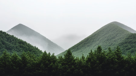mountains covered in mist and adorned with trees create a captivating scene in this atmospheric woodland image. shot with a zeiss batis 18mm f2.8 lens on a nikon d850, the green and gray tones add to the narrative-driven visual storytelling. the lush brushstrokes and panel composition mastery enhance the overall beauty of this photograph. ai generated
