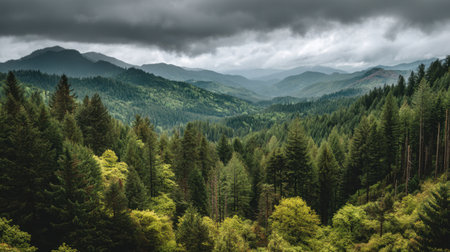 Majestic mountains tower over a serene spruce forest beneath a dramatic sky, showcasing nature beauty at dusk. Towering mountains with rolling hills and moody sky highlighting peaceful wilderness. AI.