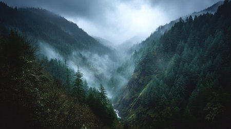 Experience the breathtaking beauty of a misty mountain landscape with lush forests and towering trees, perfect for nature enthusiasts and outdoor adventurers.