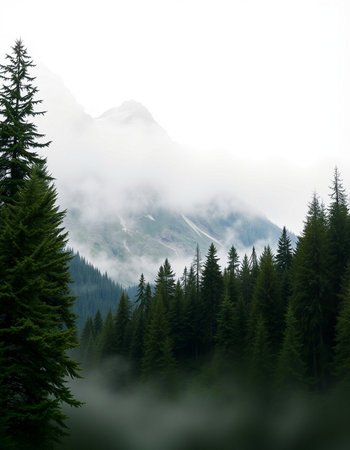 Explore a breathtaking forest landscape where majestic mountains meet lush evergreen trees, shrouded in mist, creating an atmosphere of serene tranquility.
