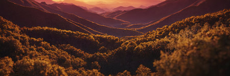 Colorful autumn landscape in the mountains at sunset. Panoramic view