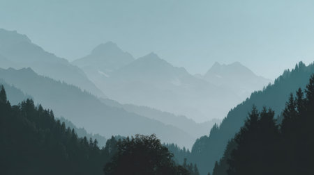 A tranquil mountain landscape featuring lush green forests and layers of blue mist over majestic peaks. This serene view captures the beauty of nature at dawn, perfect for inspiring peace.