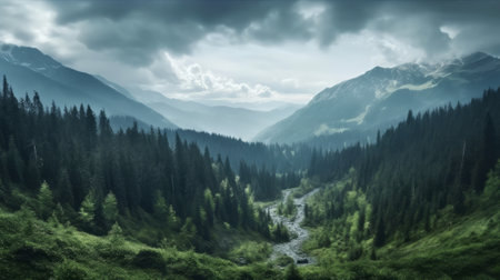 Beautiful green forest landscape with mountains in the background. Panoramic view of a misty valley, in the style of National Geographic photography, with a detailed shot taken on a Canon EOS M2 lens with mood lighting. --ar 8:3 --v 6.1 Job ID: 35dfba15-280d-4d41-96e2-0bb37b5fc29a