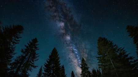 Galactic core of the Milky Way captured in stunning detail, framed by silhouettes of tall pine trees