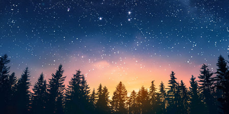 A serene evergreen forest silhouette under starry night sky with warm orange glow on horizon, evoking tranquility and wonder