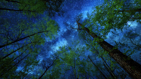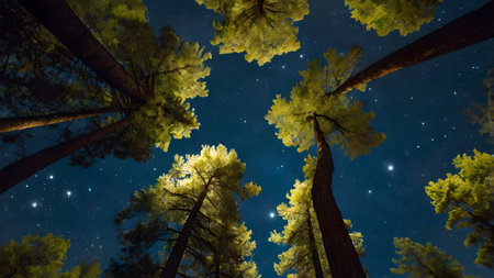 An upward perspective captures a forest canopy under a starlit night. Tall trees with textured bark and green foliage frame the dark blue sky. The composition emphasizes the natural environment with a focus on lighting and atmosphere. Suitable for a variety of editorial and commercial applications.