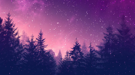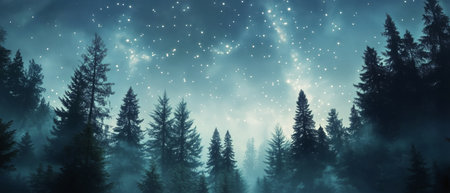 Tall evergreen trees create dramatic silhouettes against a misty night sky filled with stars. The serene forest atmosphere evokes tranquility and wonder.