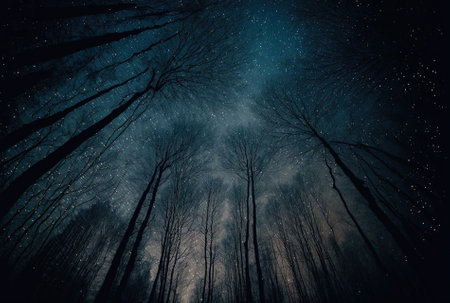 lovely low angle photograph of a woodland in the darkness of a starry night sky