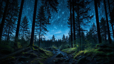 Forest and pine trees landscape under blue dark night sky with many stars, milky way cosmos background
