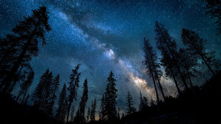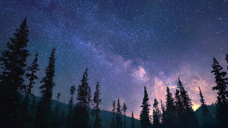 Milky Way over the forest with pine trees and starry sky
