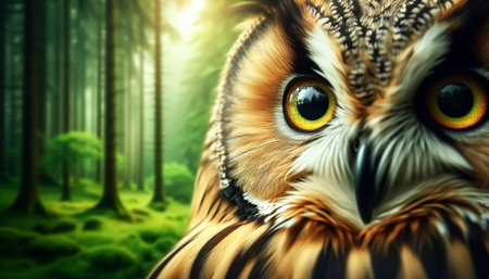Owl's eyes in the forest at dusk, mysterious wildlife