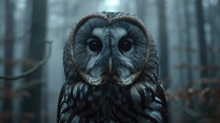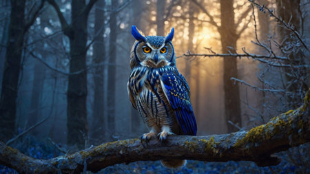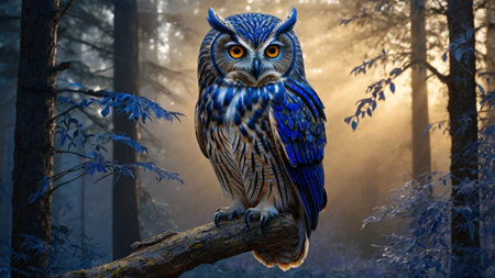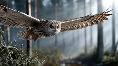 A stunning owl sits on a branch, surrounded by a misty forest. The soft dawn light creates an ethereal mood, emphasizing the beauty of nature and wildlife.